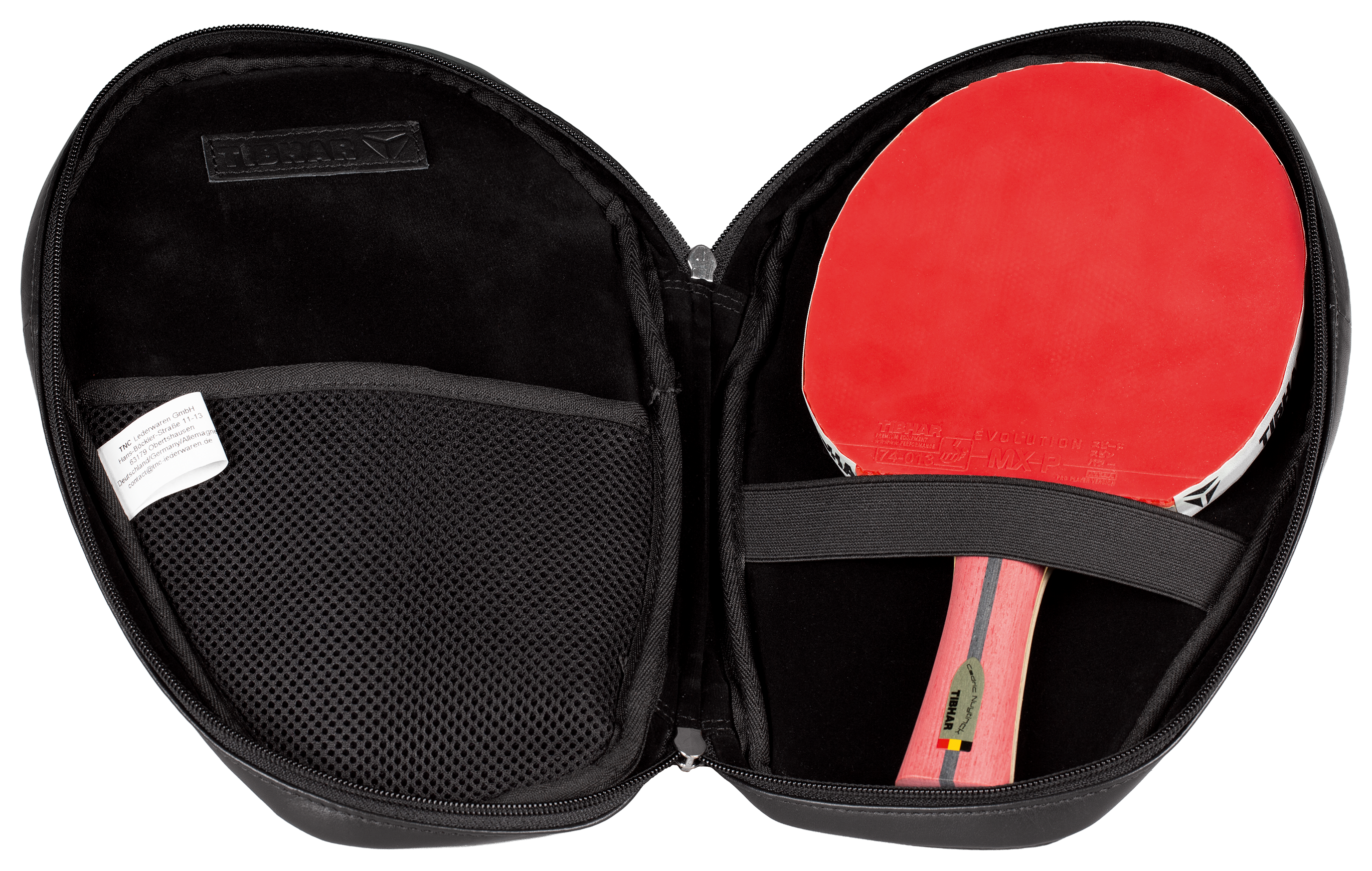 - Runde, gepolsterte Hartschalenhülle aus hochwertigem Leder für die sichere Aufbewahrung eines TT-Schlägers